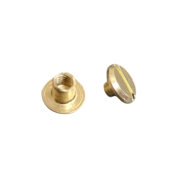 Болт металлический золотистого цвета, длина ножки в закрученном виде 5 мм. Состоит из двух частей. Часть болта с внешней резьбой имеет шляпку со шлицом. Шляпка ответной части болта без шлица с внутренней резьбой.
